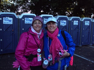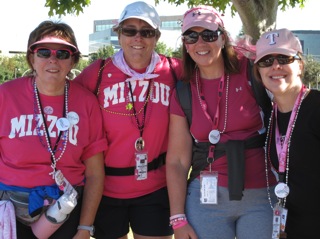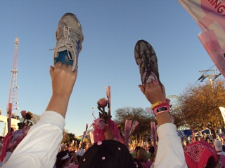 Friday morning the day of the event arrived early, up at 5am. Leaving the hotel on a shuttle along with a few hundred other walkers we headed to Collin Creek Mall in Plano. The air was very crisp — even could be considered Cold. At the event starting site there were lots of workers who were busy loading the walkers’ gear into dozens of U-haul trucks. Then we walked over to the area designated for the opening ceremony, but we had to wait about 2 hours before every thing was ready to start — maybe we were waiting for daylight?? There was lots of lively music but the 2 hour wait before we started was hard on my feet, and did by the end of the day add up to some serious sore feet.