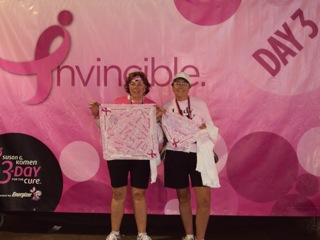 Been waiting to get a chance to write my thoughts of the Susan G Komen 3 Day 60 mile experience. To start just as in training it was a FULL on Experience — physical, mental, emotional and spiritual. Beth, my sister, and I had an uneventful drive to Big D. Arriving we checked into the hotel then out to our brother and sister-in-law’s house for dinner and a brief visit. Good food and some hugs from our 4 year old niece and 2 year old nephew.