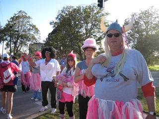 Walkers in all shapes, size, gender, and age were in full force and PINK everything – hats, socks, tulle, bras, etc! The youngest person I spoke with was 15 the oldest somewhere in her 70s. Clearly all had a passionate personal reason they were doing the 3 day. Many walkers displayed something with the name/s of persons they were walking for or in memory of on their person in some manner. Two sisters wearing a picture of their mother who the had lost the battle or a single woman walking for a friend fighting for her life had her name on her t-shirt. Survivors of all time frames 1, 2 or 9 years all sharing their excitement for life and where they were in the cancer journey. The men walking were interesting and most were on a team they also were walking for someone special. Lots of t-shirts with clever saying on them. Many costumes, hats, but always lots of PINK.